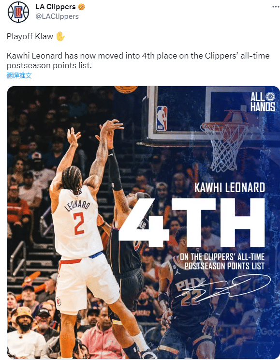 小卡全场苦战42分钟,24投13中、三分5中3拿到38分5篮板5助攻,小卡创纪录,快船生涯季后赛总得分升到队史第4位。