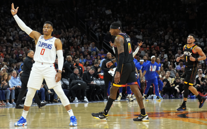 最后时刻,威少大秀以及不断拍打胸肌激情庆祝,是快船掀翻太阳的大功臣之一。