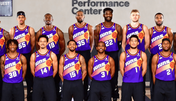 在太阳全队大合影上,太阳教练组成员站在前排两侧,蒙蒂-威廉姆斯站在萨宾-李身旁,沙梅特、佩恩、保罗、布克和奥科吉都站在第一排,其中保罗面带笑容站在中间C位。