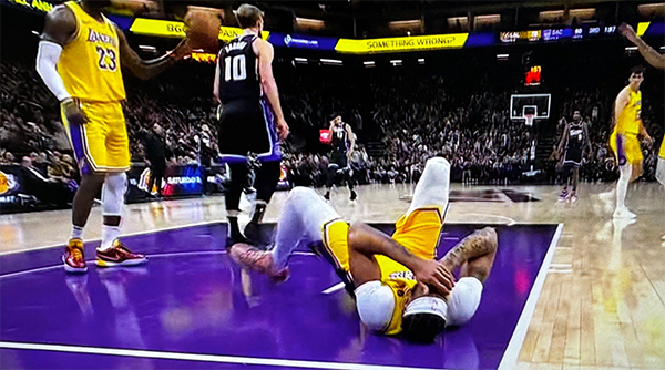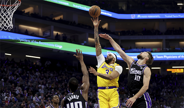 第三节,浓眉哥转身勾手造了小萨犯规,他两罚全中。在湖人陷入到得分荒的情况下,浓眉哥通过罚球和上篮,连得4分。里夫斯传球,浓眉哥跳投命中。浓眉哥防守小萨,被对手撞倒之后国王得分,他投诉进攻犯规未果。三节结束湖人已经落后15分。