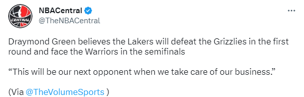 谈到湖人和灰熊系列赛,格林公开表示:这将是很激烈的一个系列赛,这个对决将会很精彩,我认为湖人将拿下这个系列赛,灰熊将会给湖人带来一些麻烦,一切都不会很容易,但我认为湖人将是我们在西部半决赛的对手。