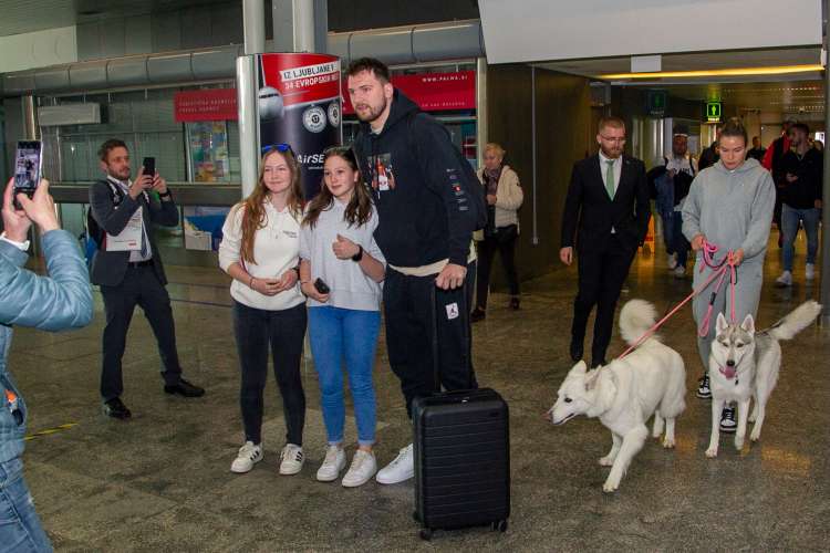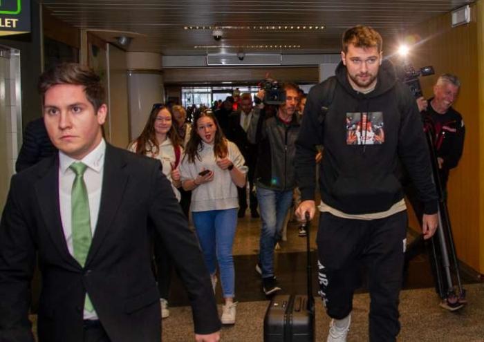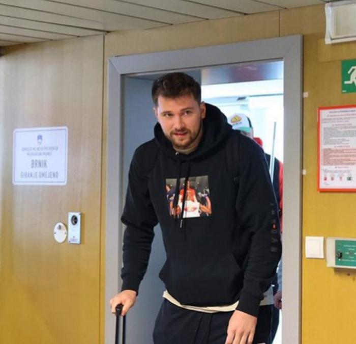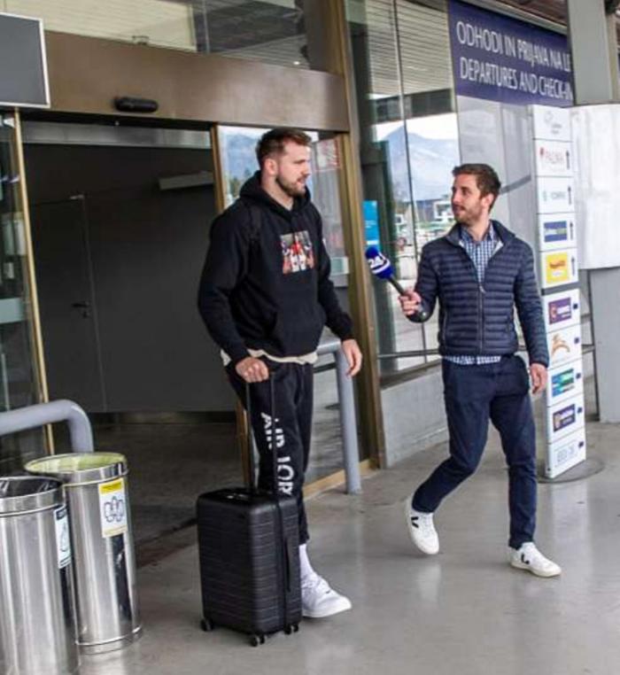 东契奇身穿黑色连帽卫衣,背着双肩包、提着行李箱飞抵斯洛文尼亚走出机场,东契奇的女友牵着宠物狗,跟在东契奇身后;在机场通道中,两美女看到东契奇时十分惊讶,只是两位女粉丝成功和东契奇合影留念,东契奇女友站在后面牵狗抢镜。