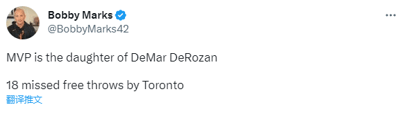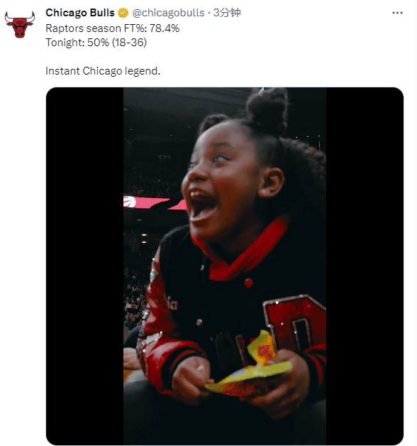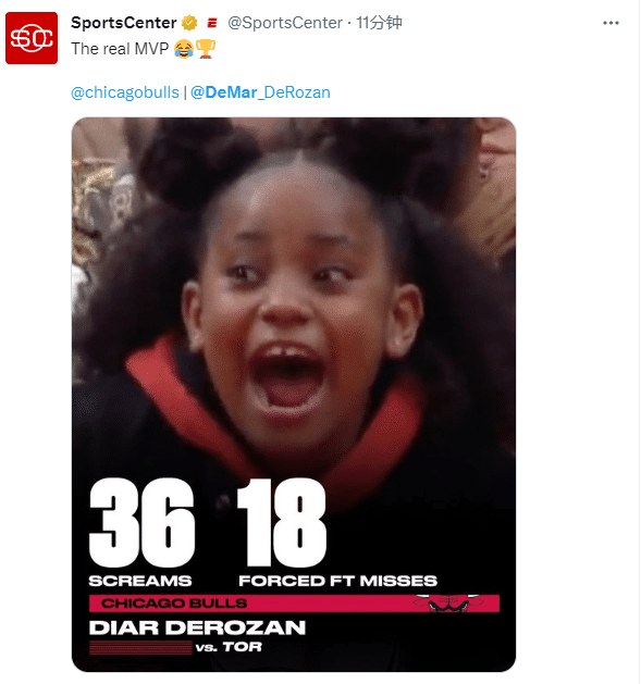 公牛赢球,德罗赞的女儿引狂赞,名记鲍勃-马克斯以及美媒NBA Central、SportsCenter直呼德罗赞女儿是真正的MVP;公牛官方晒德罗赞女儿尖叫视频,配文写道:猛龙本赛季罚球命中率78.4%,今天只有50%,公牛传奇。