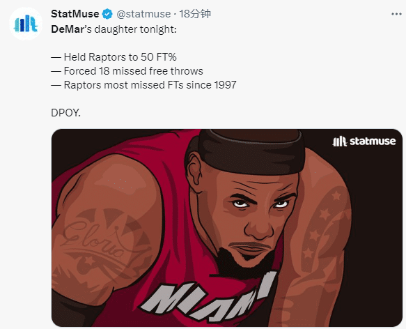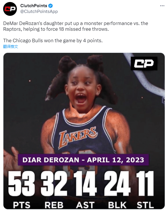 美媒ClutchPoint表示德罗赞的女儿让猛龙罚丢18球,公牛险胜逆转,把张伯伦头像P成德罗赞女儿照,写着德罗赞女儿,2023年4月13日轰下53分32篮板14助攻24盖帽和11抢断。