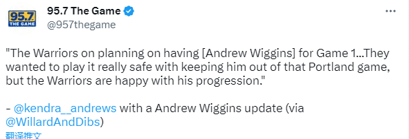 勇士跟队记者Kendra Andrews报道,勇士计划让维金斯在季后赛对阵国王第一战中复出,Andrews还表示,勇士本想让维金斯在昨日对开拓者的比赛中复出,但他们出于安全考虑没有让他上场。