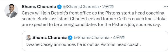 据名记Shams报道,活塞主教练凯西不再担任主教练,他将会进入球队管理层;乌度卡和雄鹿助教查尔斯-李是活塞帅位的候选人。