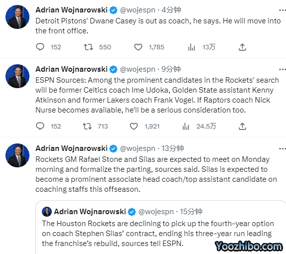 178直播04月10日讯 ,NBA两大主帅下课,火箭解雇主帅塞拉斯,火箭新帅目标出炉,湖人旧帅和勇士主帅在列;活塞主帅凯西正式辞职,将进入球队管理层。