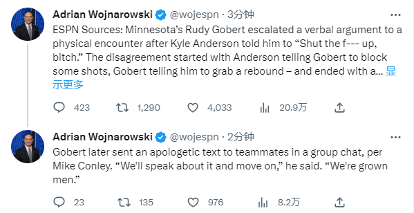 Woj还报道,安德森爆粗口说了一句“BixxHM闭上你的臭嘴!”,随即戈贝尔给了安德森一拳;据康利透露,戈贝尔已经在群中向队友道歉。