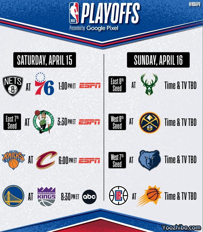 NBA季后赛将在4月16日开打,第一天四组对决分别是凌晨1点76人主场大战篮网;凌晨3点30分凯尔特人大战东部第七(待定);早上6点尼克斯大战骑士,8点30分勇士客场挑战国王。