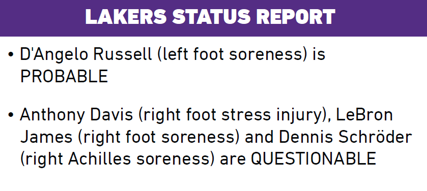 詹姆斯、浓眉都在伤病名单上,但预计他们都会出战收官战;施罗德可能复出,此前施罗德表示:我不只是颈部有疼痛感,我还在处理跟腱痛疼的问题。我正在努力休养,希望能早点回来,收官战能否复出要看他的身体状态。