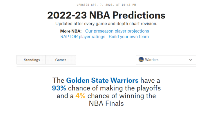 根据权威网站FiveThirtyEight最新预测,勇士晋级季后赛的概率为93%,夺冠概率为4%。