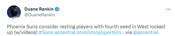 178直播04月06日讯 ,曝太阳计划轮休杜兰特、布克等主力球员,据太阳记者Duane Rankin报道,随着太阳提前锁定了西部第4名,蒙蒂正在考虑在最后2场常规赛轮休球队主力;杜兰特或再次无缘对决詹姆斯,首轮可能大战勇士。