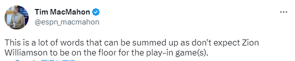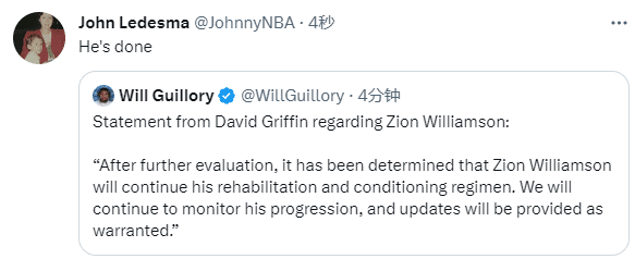 锡安还未接近复出引热议,名记Tim-MacMahon直言:不要指望锡安会出现在附加赛上;另一NBA记者John Ledesma则表示他的赛季结束了。