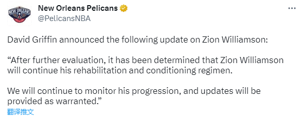 鹈鹕官方已经宣布锡安因伤缺战尼克斯,之后鹈鹕宣布锡安的最新检查结果,继续接受康复治疗,这意味着他的腿筋伤势还未痊愈。