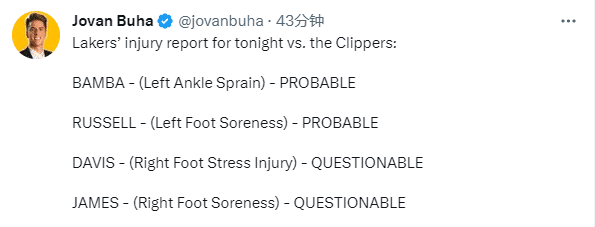 湖人战快船伤病报告——詹姆斯(右脚酸痛)和浓眉(右脚应激损伤)出战成疑,50%可能性出战;拉塞尔(左脚酸痛)和班巴(左脚踝扭伤)大概率出战,75%可能性出战。