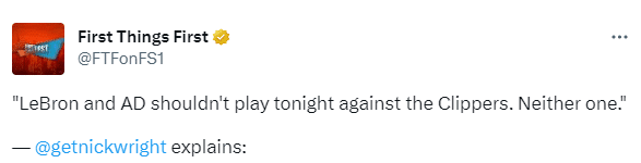 詹姆斯和浓眉对阵快船成疑,名记shams表示詹眉将在赛前做出最终决定,他们会参加赛前热身然后决定是否能够上场。