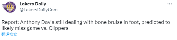 据湖人媒体Lakers Daily报道,浓眉仍旧在处理脚部骨挫伤的问题,预计他很可能缺席洛城德比;名嘴尼克-怀特更是直言勒布朗和AD都不应该参加与快船的比赛。