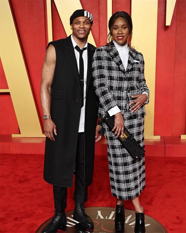 快船球星威少一套黑白穿搭,戴着针织帽亮相,如此打扮太潮了,另外威少的左手骨折处缠着护具,与妻子一起拍照;快船前锋PJ-塔克身穿一套白色礼服参加派对。
