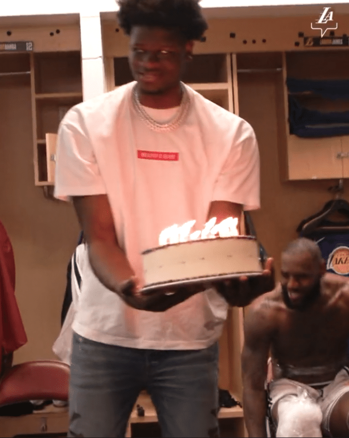 湖人赢球赛后,湖人众球员和教练组齐聚更衣室,为范德比尔特一起唱生日歌庆生,詹姆斯赤膊坐在椅子上并且冰敷双膝,班巴为他递上生日蛋糕;湖人更衣室氛围太好了,湖人官推也晒更衣室视频祝贺范德彪。