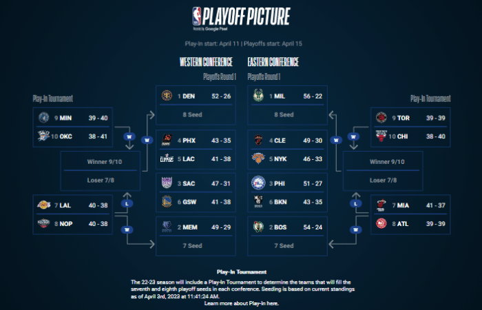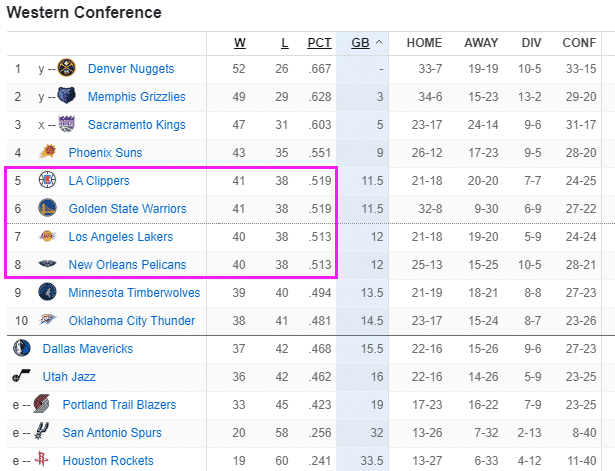 湖人记者Trevor Lane表示湖人、鹈鹕、勇士和快船都是38负,看起来这四支球队将为5-8名而战,剩余赛程湖人先后对阵爵士、快船、太阳和爵士;快船对阵湖人、开拓者和太阳;勇士对阵雷霆、国王和开拓者;鹈鹕对阵国王、灰熊、尼克斯和森林狼。