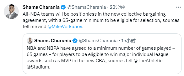 178直播04月02日讯 ,NBA最佳阵容的评选新规出炉,据名记Shams报道,在新的劳资协议谈判中,NBA最佳阵容的评选将取消位置区分,且入选最佳阵容的前提条件是至少打65场比赛;新规将在新赛季开始执行,MVP的评选也需要至少打65场比赛。