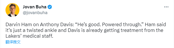 赛后湖人主帅哈姆表示浓眉的脚踝很好,很有力量,他只是扭伤了脚踝,他已经开始接受队医的治疗。
