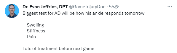 浓眉带伤坚持太振奋人心,对于他的伤势,医学专家Evan Jeffries表示浓眉脚踝明天可能肿起来而且会很痛,下一场比赛前他将接受大量的治疗。