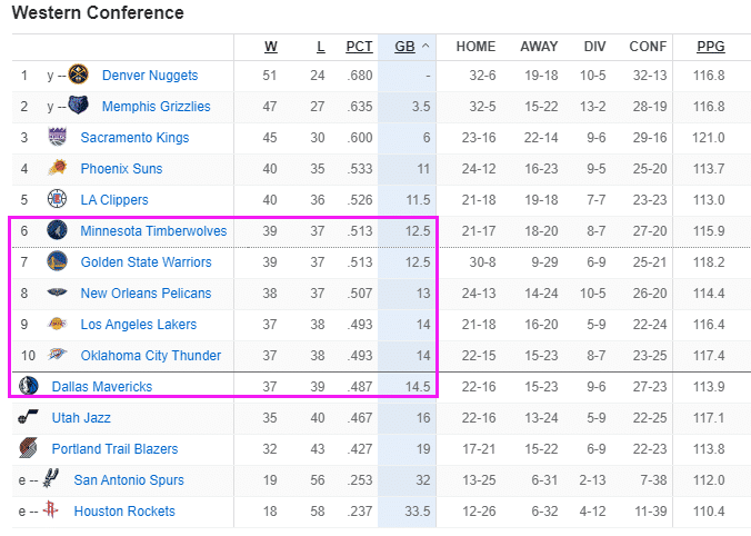 附加赛区——7、勇士39胜37负,8、鹈鹕38胜37负;9、湖人37胜38负和10、雷霆37胜38负