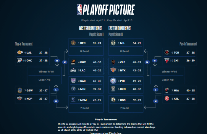 NBA官方列出对阵图,若季后赛现在开打,湖人和勇士都要打附加赛,这是十分惨烈的赛制,东西部第9和第10都是输一场直接出局。
