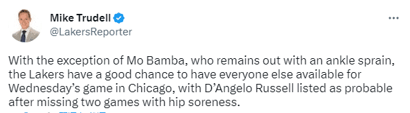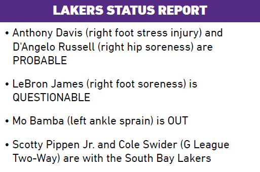 上一场湖人坐镇主场对阵公牛,詹姆斯火速复出,回归首战替补贡献19分8篮板5助攻仍输掉比赛;下一场再战公牛,詹姆斯和浓眉都可能出战,拉塞尔的状态升级为大概率出战;湖人记者Mike Trudell表示预计除了班巴因脚踝扭伤无法出战外,其他球员都很有可能参加周四与公牛的比赛。