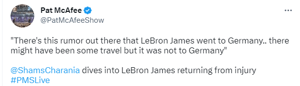詹姆斯遭遇右脚肌腱撕裂,伤势康复速度惊人,仅休战四周就重返赛场;名记shams表示詹姆斯没有前往德国接受治疗:詹姆斯回归阵容的时间远远早于预期。他说他看过的两位医生说他需要接受将导致他赛季报销的手术,最终他在四周后就复出了。存在一条流言说他去了德国,我被告知他没有去德国,他进行了一番出行,但不是前往德国。这可能会推翻许多网上的理论。如果有人能比NBA历史上的任何人都痊愈得更快,那个人必须是勒布朗。他的那些脚踝扭伤、肘部伤病等等,他的回归时间都远远早于任何NBA球员。我没有得到关于他去了某个地方的否认,但那不是德国,这是我所听说的情况。