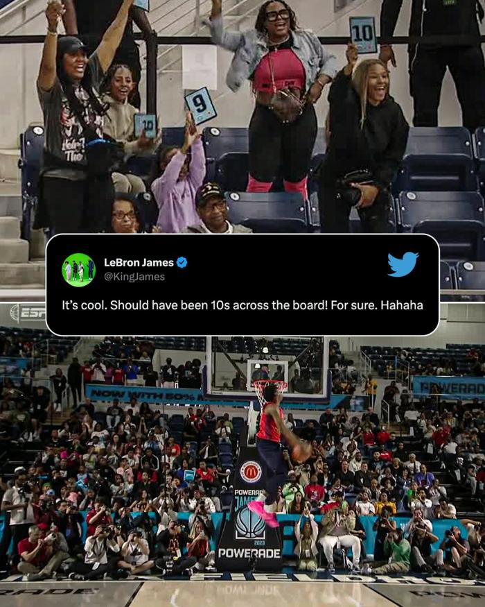有趣的是,朱莉和詹姆斯的观点不一致,朱莉在现场举着9分的标牌,换言之,她认为布朗尼的大风车背扣不该获得满分。