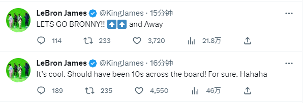 詹姆斯还在社媒上和别人互动,有人问布朗尼能从三分线起步扣篮?詹姆斯回应8个笑哭的表情。