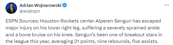 178直播03月11日讯 ,火箭21岁新星阿尔佩伦-申京的检查结果出炉,据espn名记woj报道,申京避免了严重的伤病,遭遇脚踝严重扭伤和膝盖骨挫伤,暂无回归时间表。