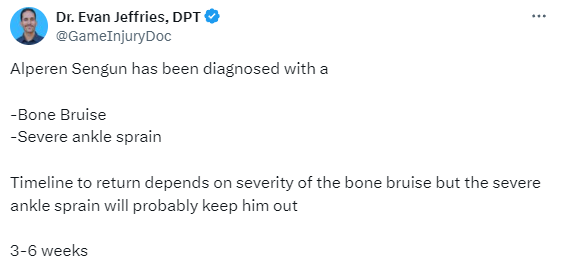 据悉,赛后申京拄着拐杖离开黄金一号球馆;医学专家表示最坏情况是申京的前交叉韧带撕裂,可能伴有半月板损伤;如今申京的伤情确诊为脚踝严重扭伤以及膝盖骨挫伤,专家表示他的回归时间取决于骨挫伤的严重程度,但严重的脚踝扭伤可能会让他无法参赛,预计伤停3-6周。