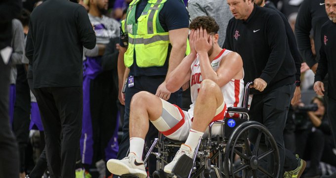 在火箭三杀国王的比赛中,末节还剩40秒,场上发生令人揪心的受伤事件——小萨博尼斯持球反击,申京在回防落地时不幸扭伤脚踝(90度崴脚)和膝盖,倒地不起,捂着膝盖撕心惨叫;火箭众将都赶紧围过来,接受队医的检查后,申京坐着轮椅离开球场,双手捂脸十分难受;小萨一脸懊恼,国王球员以及现场球迷为申京送上掌声。