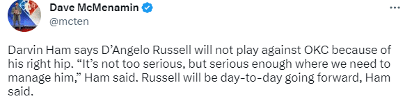 拉塞尔因伤缺战雷霆,哈姆表示施罗德将顶替拉塞尔首发,还表示:拉塞尔的右臀不太舒服,不太严重。但是已经到了需要我们进行伤病管理的状态,他接下来将进入每日观察的状态。