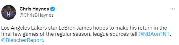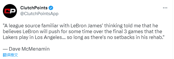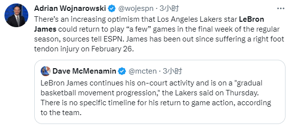 名记shams、woj以及Haynes纷纷报道詹姆斯有望出战常规赛最后3-4场比赛,名记Dave McMenamin则报道:一位熟悉勒布朗-詹姆斯想法的联盟消息人士告诉我,只要他的康复没有遇到任何挫折,他相信勒布朗会出战常规赛最后3场比赛。