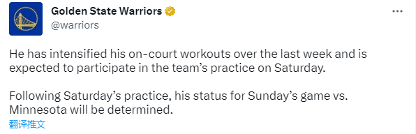 178直播03月24日,勇士官方更新小佩顿的伤情,小佩顿昨天接受了复查,他的内收肌伤势康复进度良好;上周他提升了训练强度,预计本周日参加全队训练,最快可能在下周一对阵森林狼的比赛中复出。