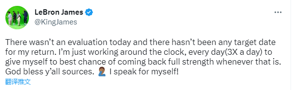 不过对于外界的复出报道,詹姆斯公开回应:今天我没接受评估,目前我也没有任何复出的目标日期。我只是日以继夜地工作,每天进行三次训练,让自己获得彻底康复的最佳机会。上帝保佑所有那些消息源。我为自己发声!