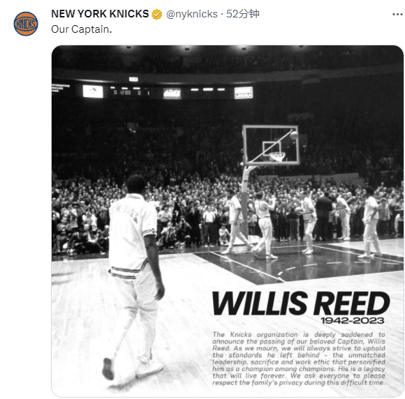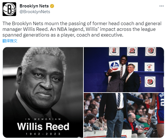 篮网官方发推:布鲁克林篮网队哀悼前主教练兼总经理威利斯-里德的去世。作为 NBA 传奇人物,不管是球员,还是教练和高管,他都影响了几代人。