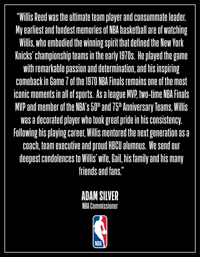 1974年4月21日,31岁的威利斯-里德因伤宣布退役。在效力尼克斯队的10年中,里德的各项技术统计都列全队前10,尼克斯队在1976年10月21日为他的19号球衣举行了退役仪式。