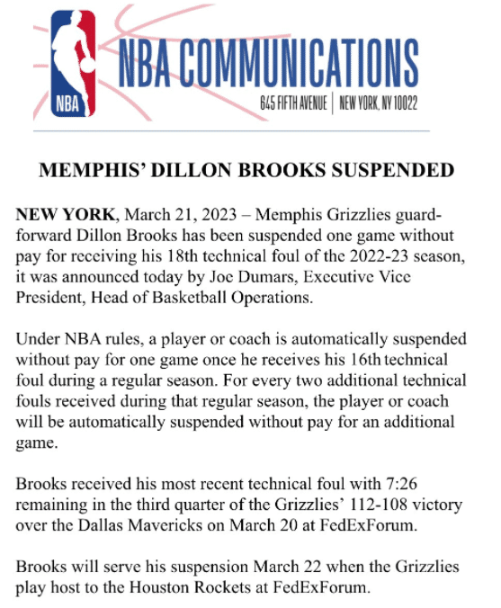 在灰熊和独行侠的比赛中,狄龙扣篮后夸张庆祝以及嘲讽独行侠替补席,吃到本赛季个人第18次技犯,根据联盟规则,在一名球员获得他的第16次技术犯规后,每增加两次技术犯规将被停赛。