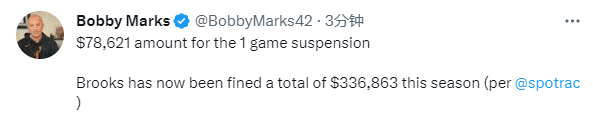 178直播03月22日讯 ,NBA官方公布禁赛罚单,灰熊悍将狄龙-布鲁克斯累计吃到18次技术犯规,又自动停赛一场,缺席与火箭的比赛;狄龙又损失将近8万美元,本赛季累计损失约34万美元,不过他本人壕横回应:就是一些纸罢了。