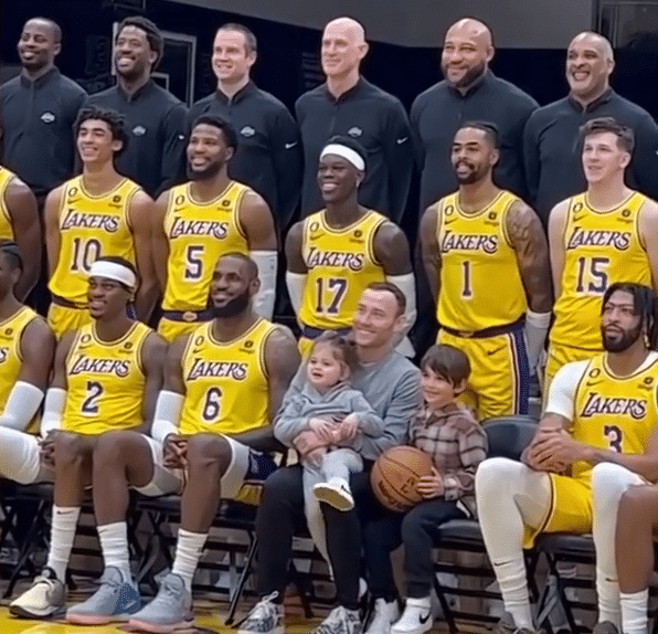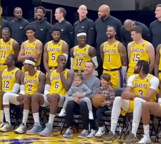 施罗德、拉塞尔、里夫斯、比斯利以及克里斯蒂都站在第二排,哈姆、汉迪等湖人教练组成员都站在最后一排;合影期间,施罗德示意浓眉笑一笑,之后浓眉强颜欢笑;詹姆斯、施罗德等人都满脸笑容。