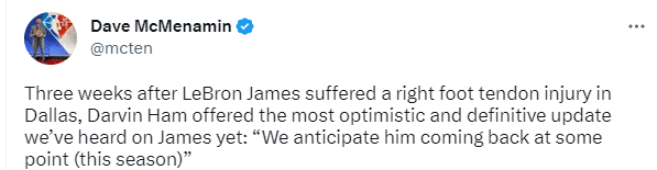 詹姆斯右脚肌腱康复的最大利好消息,湖人主帅哈姆表示,我们预计詹姆斯将在本赛季的某个时间点回归;詹姆斯确定本赛季复出,对于湖人来说,这真是一个天大的好消息;据此前报道,詹姆斯可能前往德国接受了PRP富血小板血浆注射治疗,旨在刺激组织细胞修复。