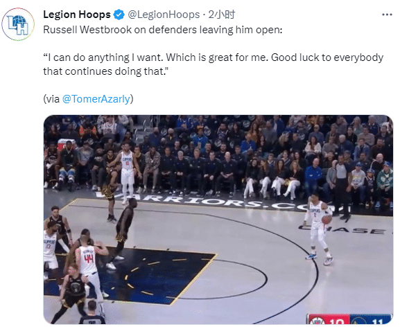 谈到在球场上经常在外线被对手放空五米的争议话题时,威少笑着说道:这样我就可以做任何我想做的事了,这对我来说太棒了。祝愿所有继续这么做(将自己在外线放空)的人好运吧。