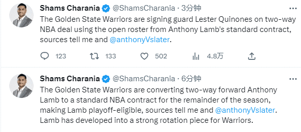 178直播03月16日讯 ,勇士连续两笔操作,据名记Shams报道,勇士计划将双向合同球员安东尼-兰姆的合同转为标准合同,后者有资格出战季后赛;与此同时,勇士将用双向合同签下莱斯特-基诺内斯。