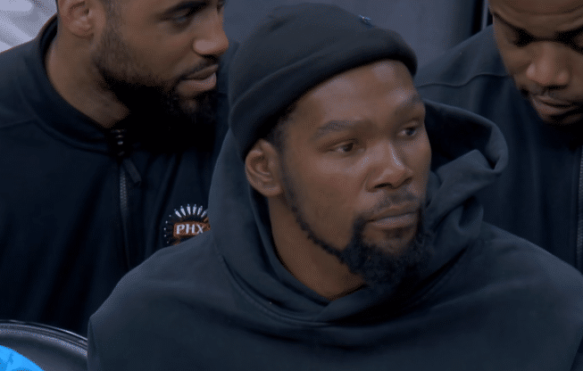 下半场,布第三节终于找回手感,外线三分也开张,单节7投4中独砍12分,带领太阳拉开分差,三节打完太阳领先9分;期间杜兰特坐在场边观战,暂停时杜兰特站在场边和太阳助教交流,并且鼓掌为队友们加油打气。