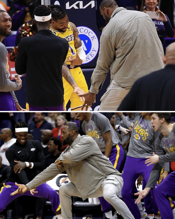 湖人客场对阵鹈鹕,这是一场关键的卡位战,湖人14-0疯狂开场,詹姆斯兴奋不已——拉塞尔投进三分点燃替补席,詹姆斯和拉塞尔激情庆祝,他们之间完成专属的庆祝动作。